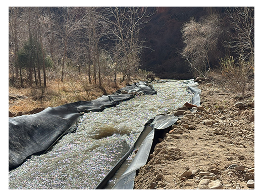 The diversion consisted of a lined channel to prevent erosion. There was some concern about water overflowing the lining during a recent winter storm, but the diversion weathered the storm unharmed. The river was dammed with Big Bags USA products—essentially giant sandbags that were placed in a row and fronted with sheeting to create a temporary dam and enable the crew to access the riverbed.